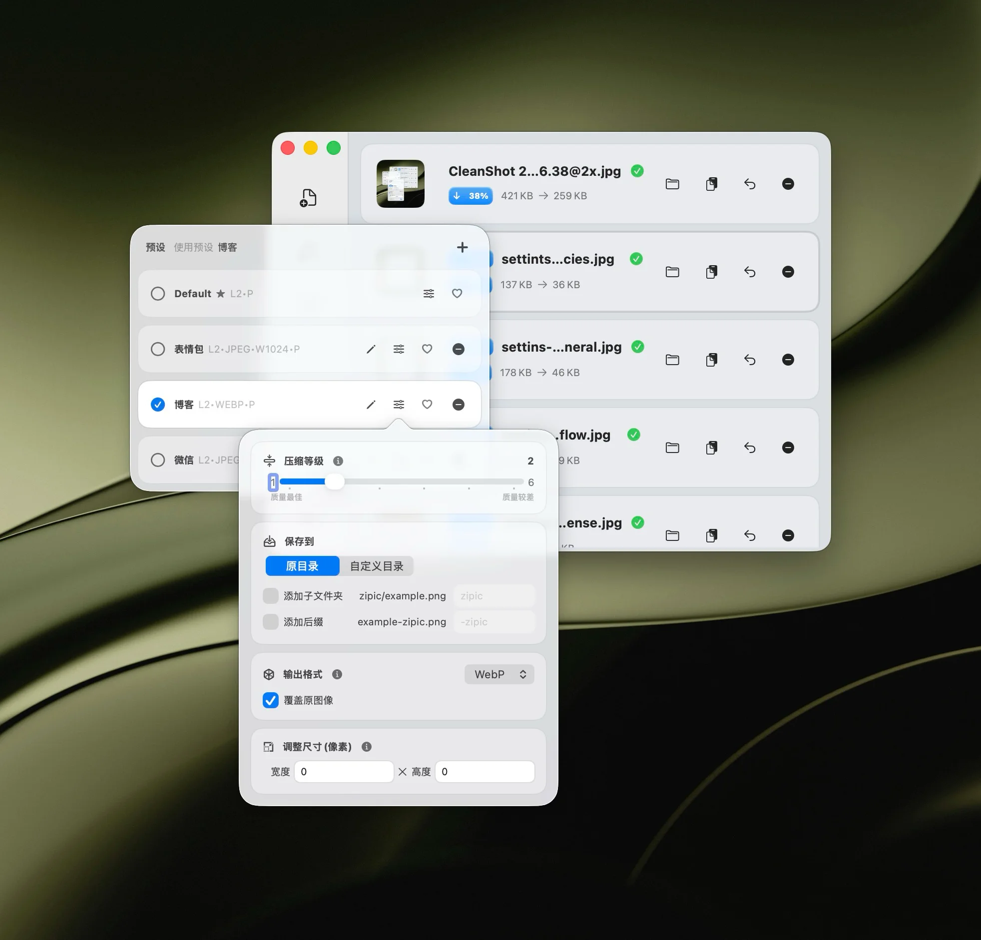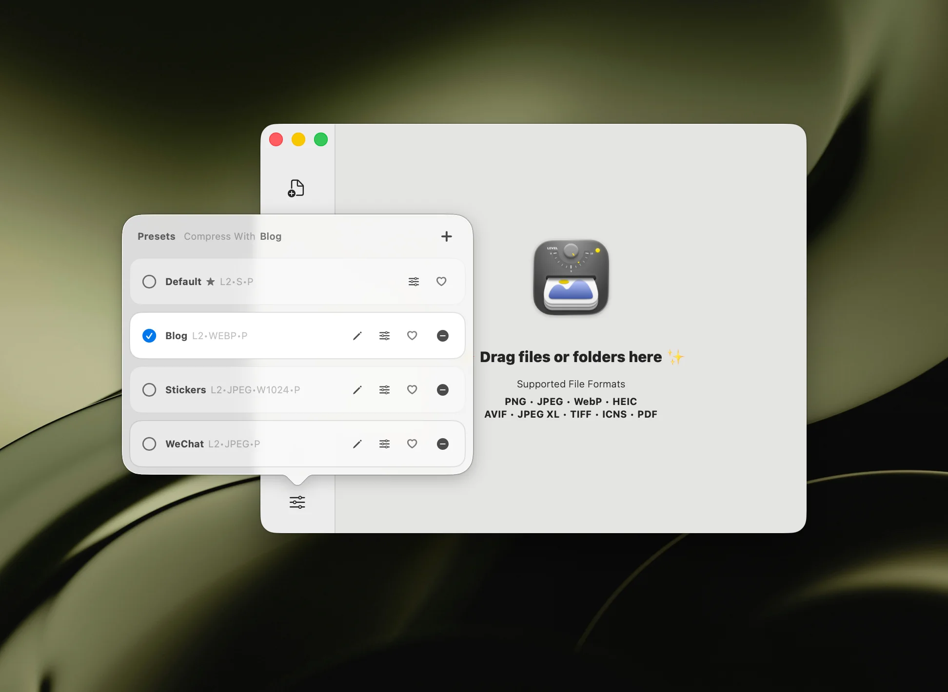 Zipic supports compressing multiple images and all images in specified folders. Currently supported formats include JPEG, PNG, WebP, GIF, HEIC, AVIF, TIFF, ICNS, PDF, JPEG-XL (JXL), with more formats planned.